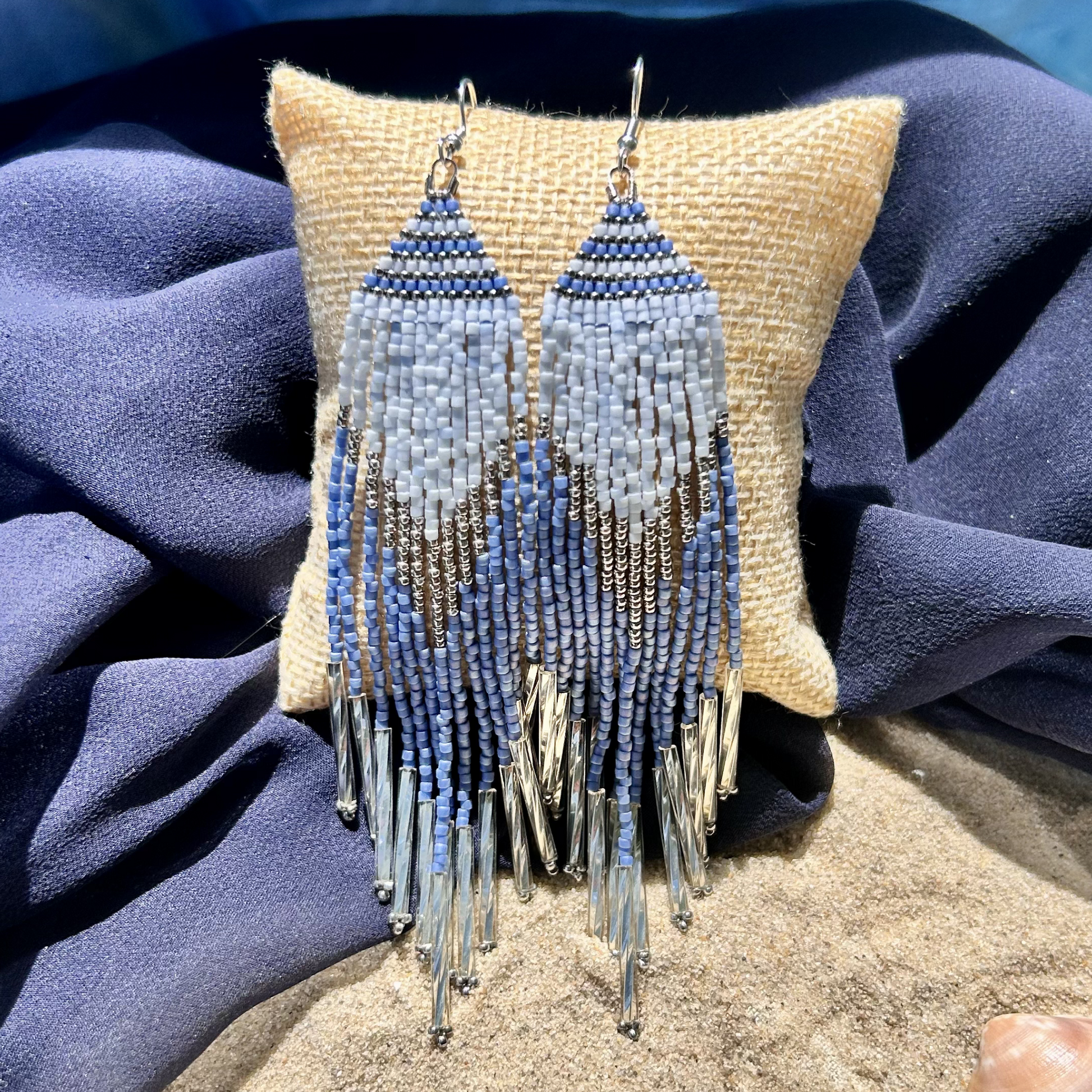 Stainless steel earrings made of ombre blue Miyuki beads and silver bugle beads.