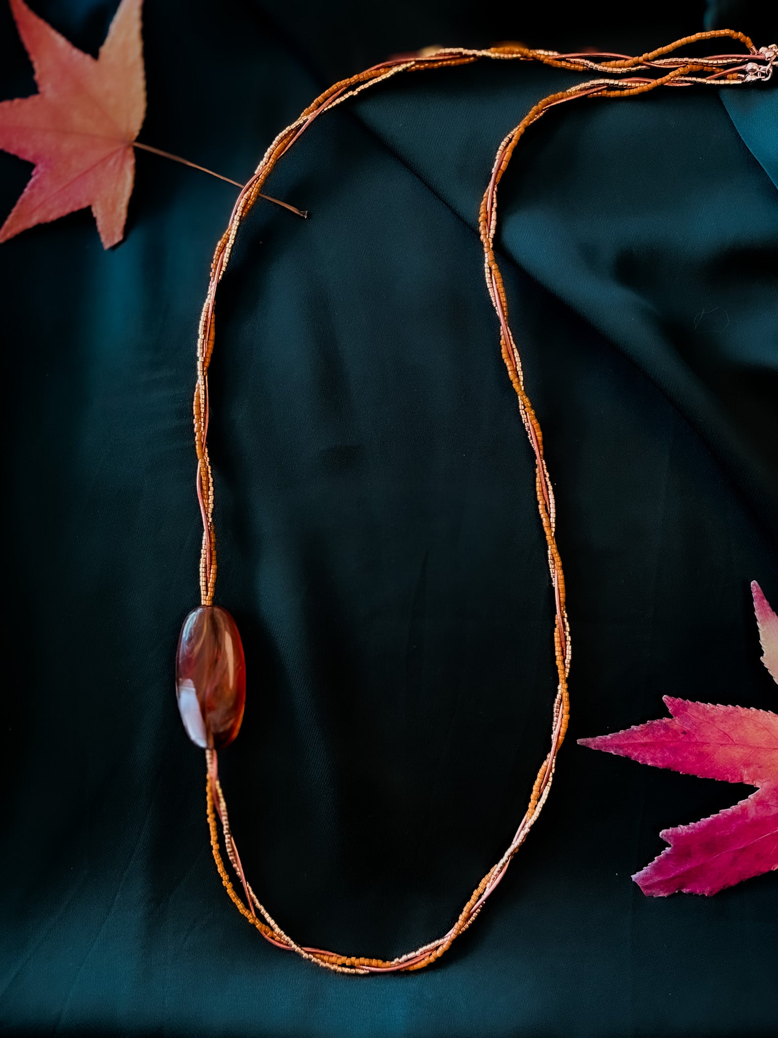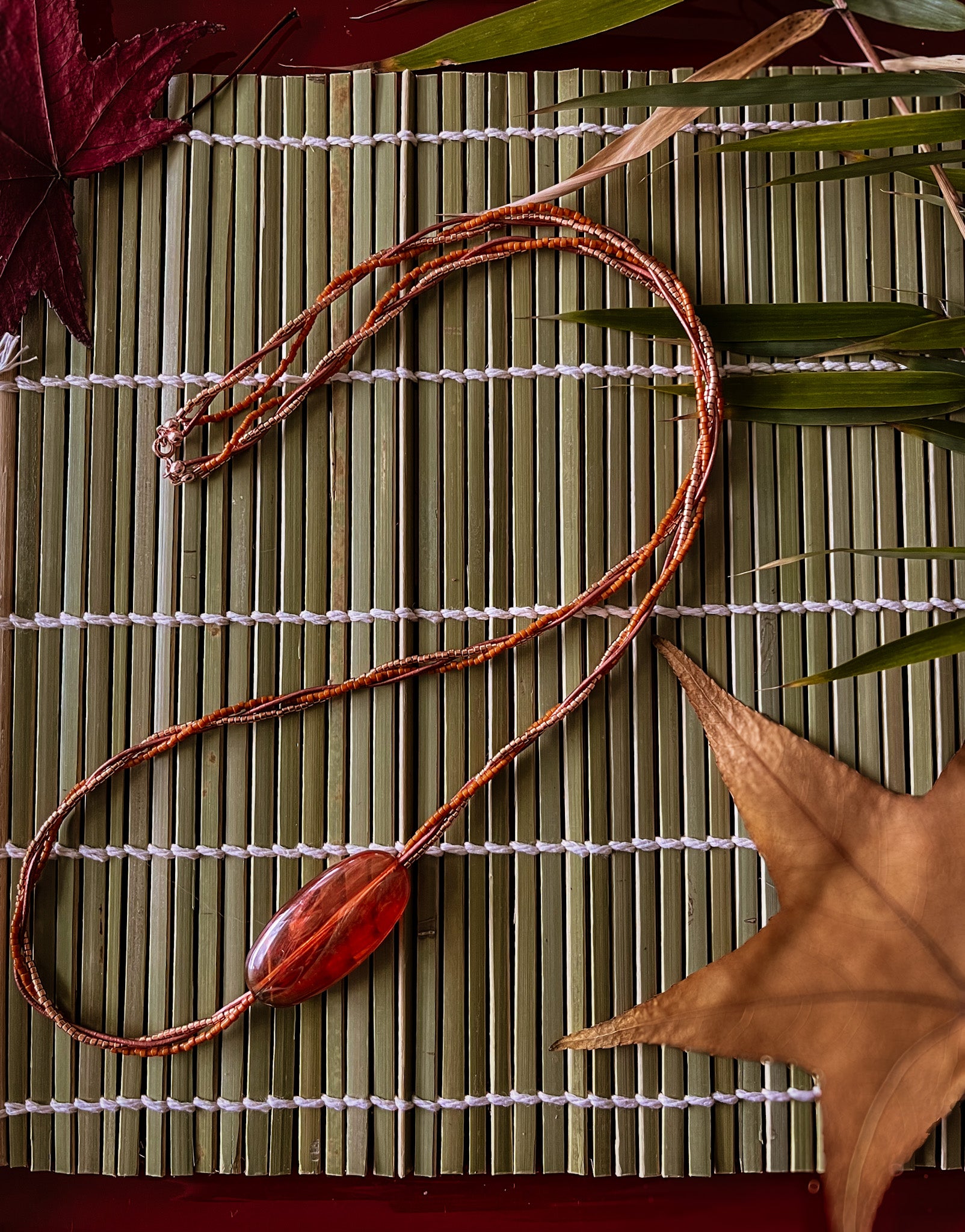 Handmade necklace featuring a warm cinnamon acrylic stone, complemented by triple strands of orange and copper Miyuki beads and a soft cinnamon leather cord.