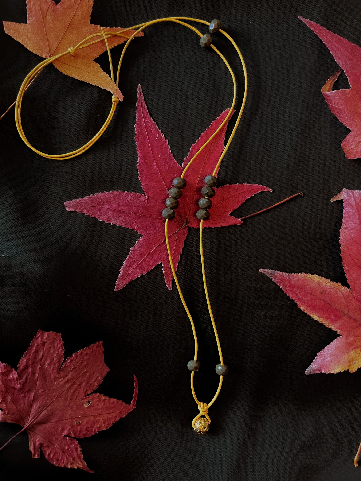 Handmade necklace featuring faceted green glass beads and a gold-plated lava stone, complemented by a golden real leather cord for an earthy, elegant look.