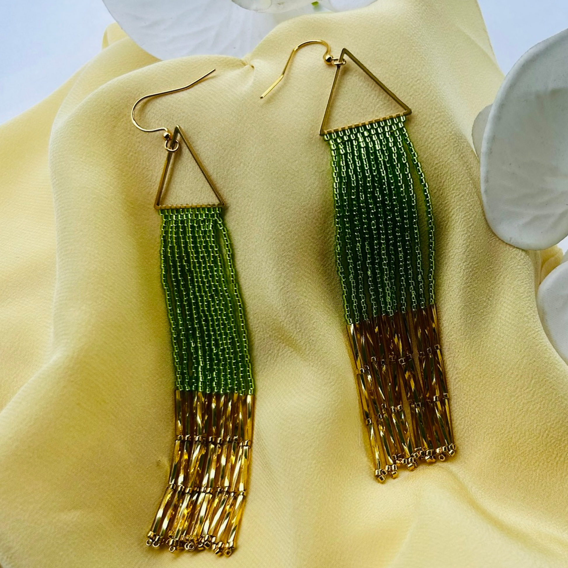 Gold-plated stainless steel earrings with lime green Miyuki beads and golden bugle beads.