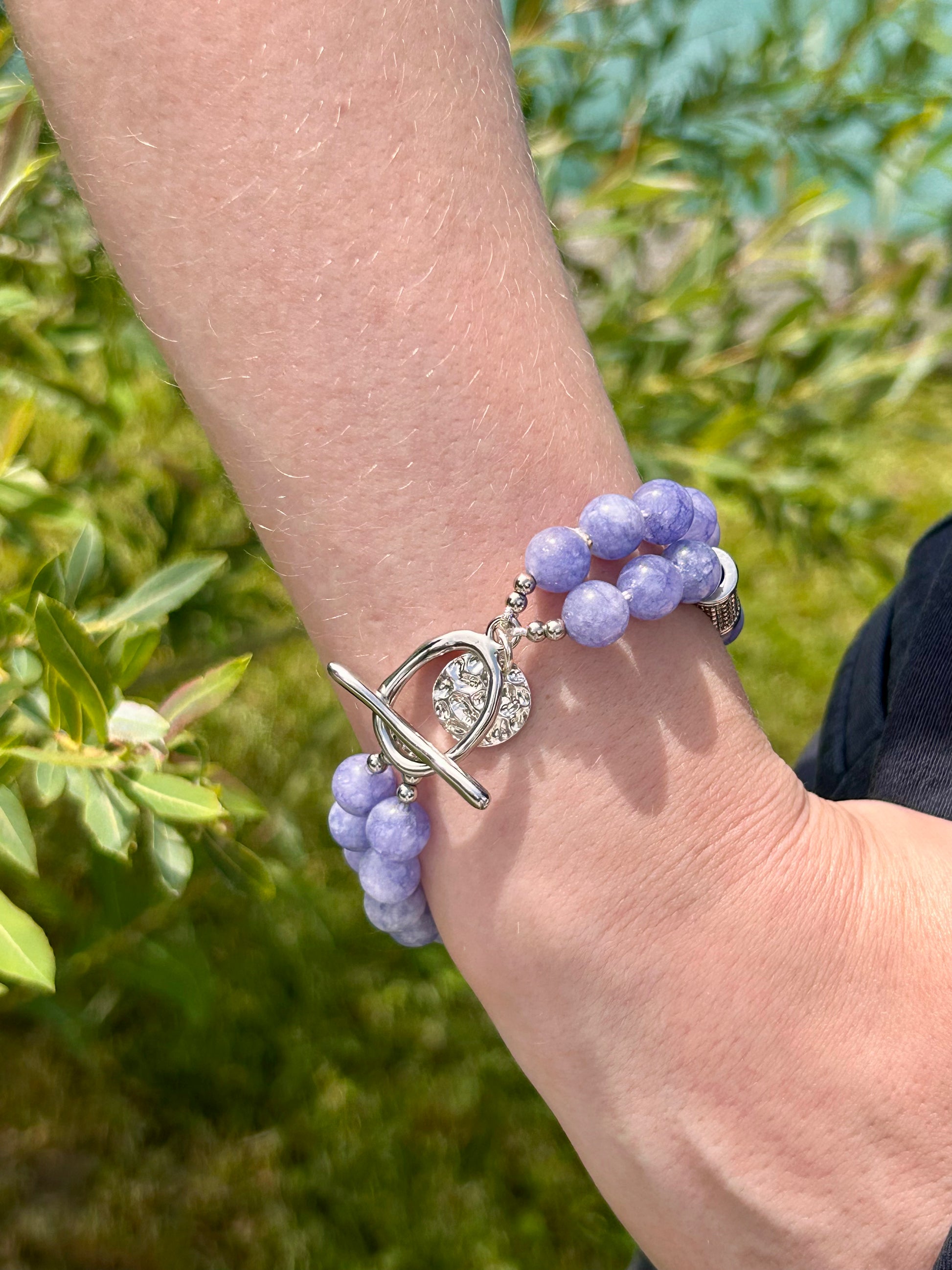 Silver-plated stainless steel bracelet with blue quarz and a threading clasp.