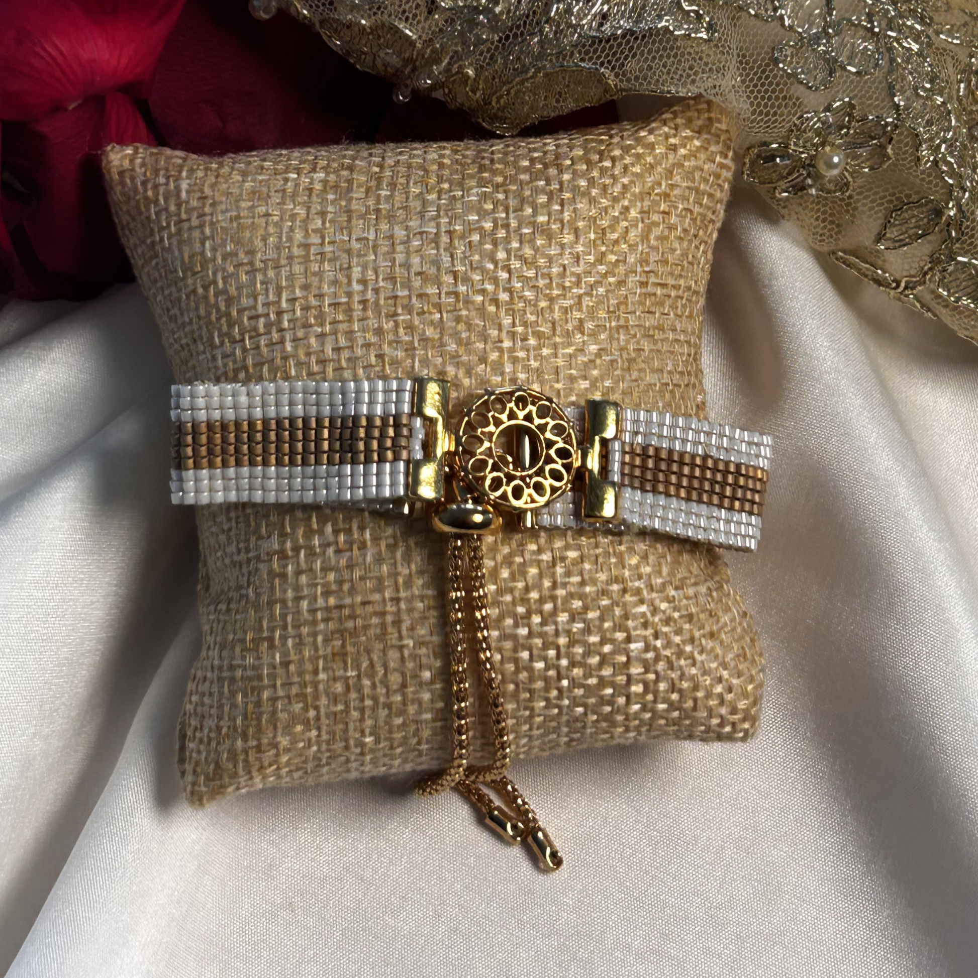 24-karat gold plated bracelet with white and champagne-colored Miyuki beads, featuring a gold-plated adjustable metal chain.