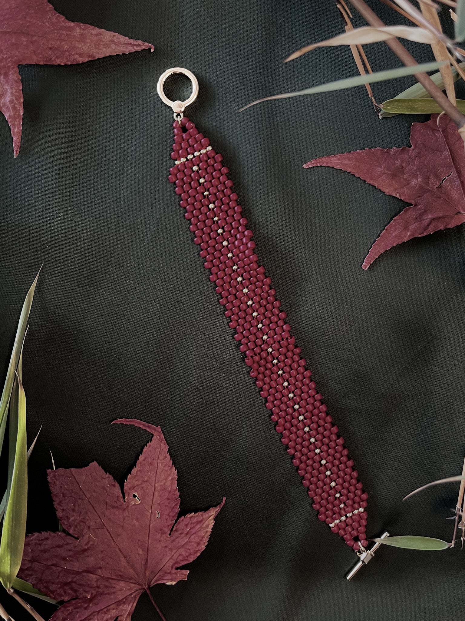 Delicate beaded bracelet made with red and golden Toho beads, secured with a stainless steel gold-plated clasp for a refined finish.