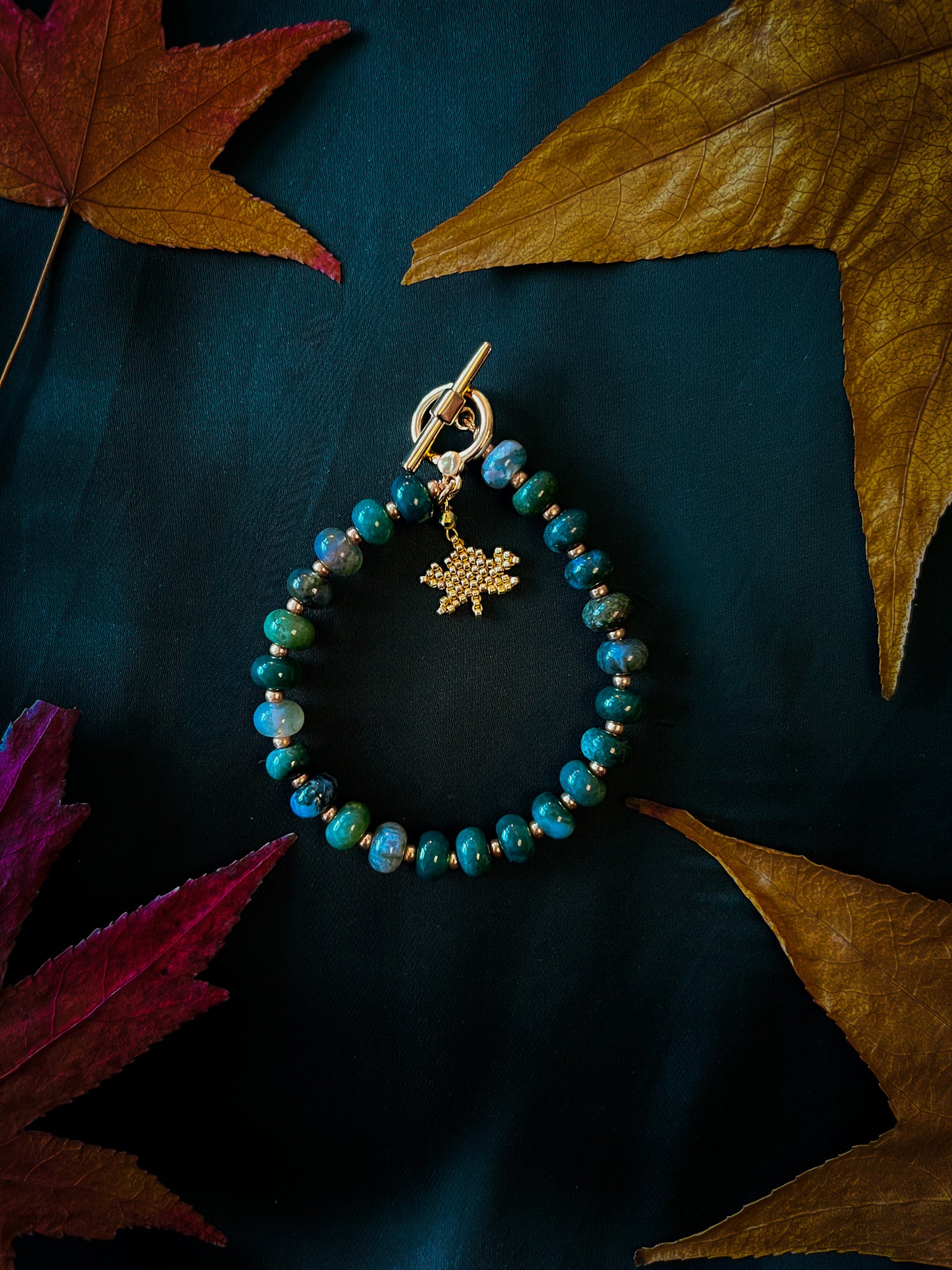Handmade bracelet featuring smooth green moss agate pearls and a gold-plated stainless steel toggle clasp, accented with a beaded maple leaf crafted from golden Miyuki beads.