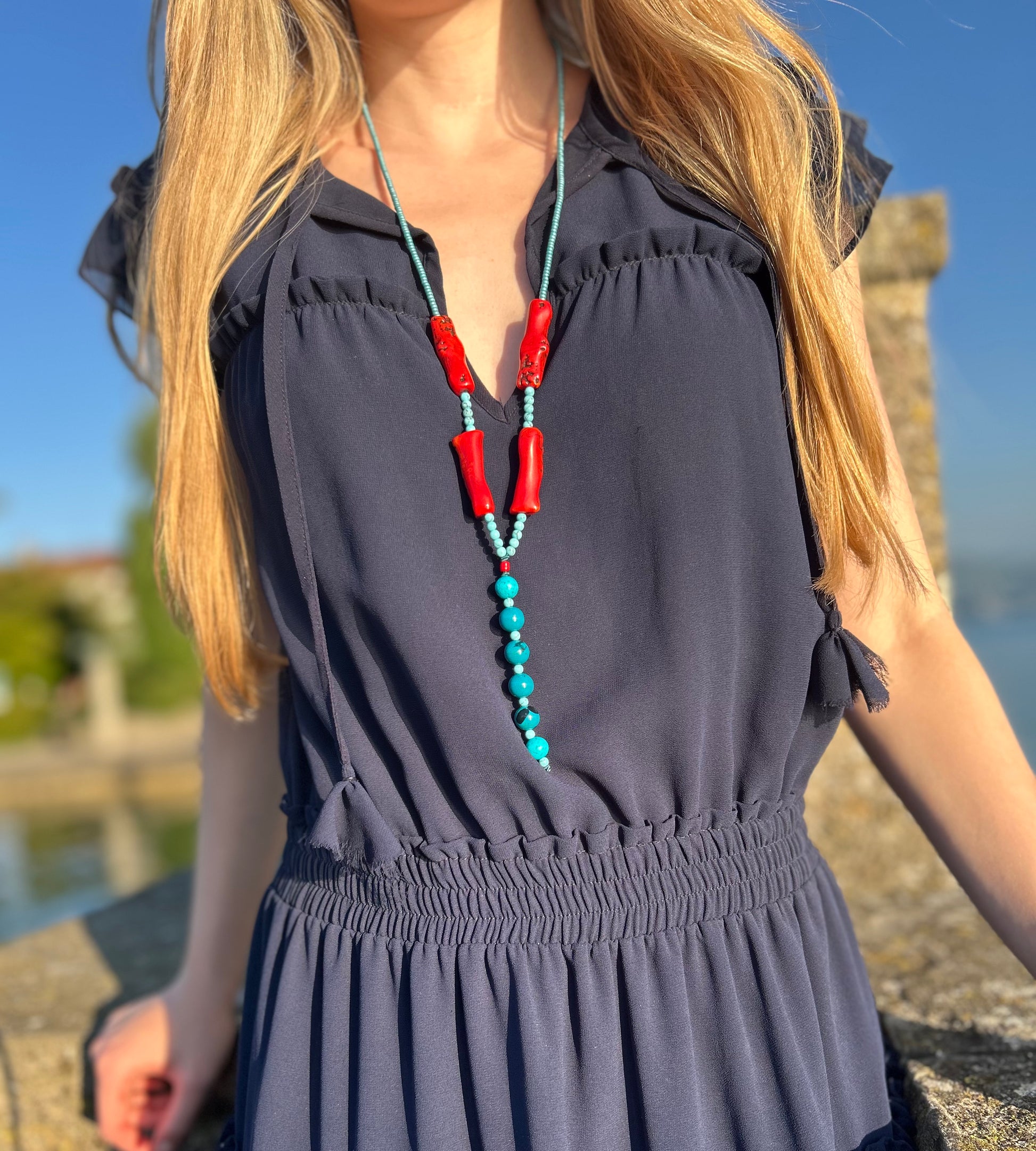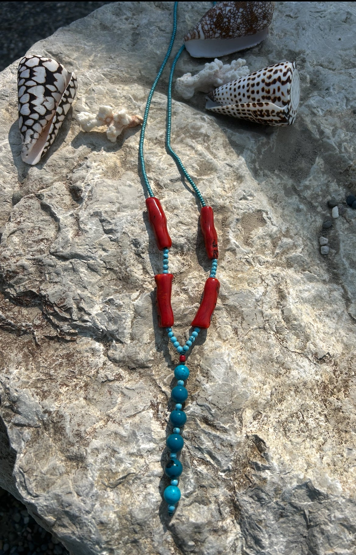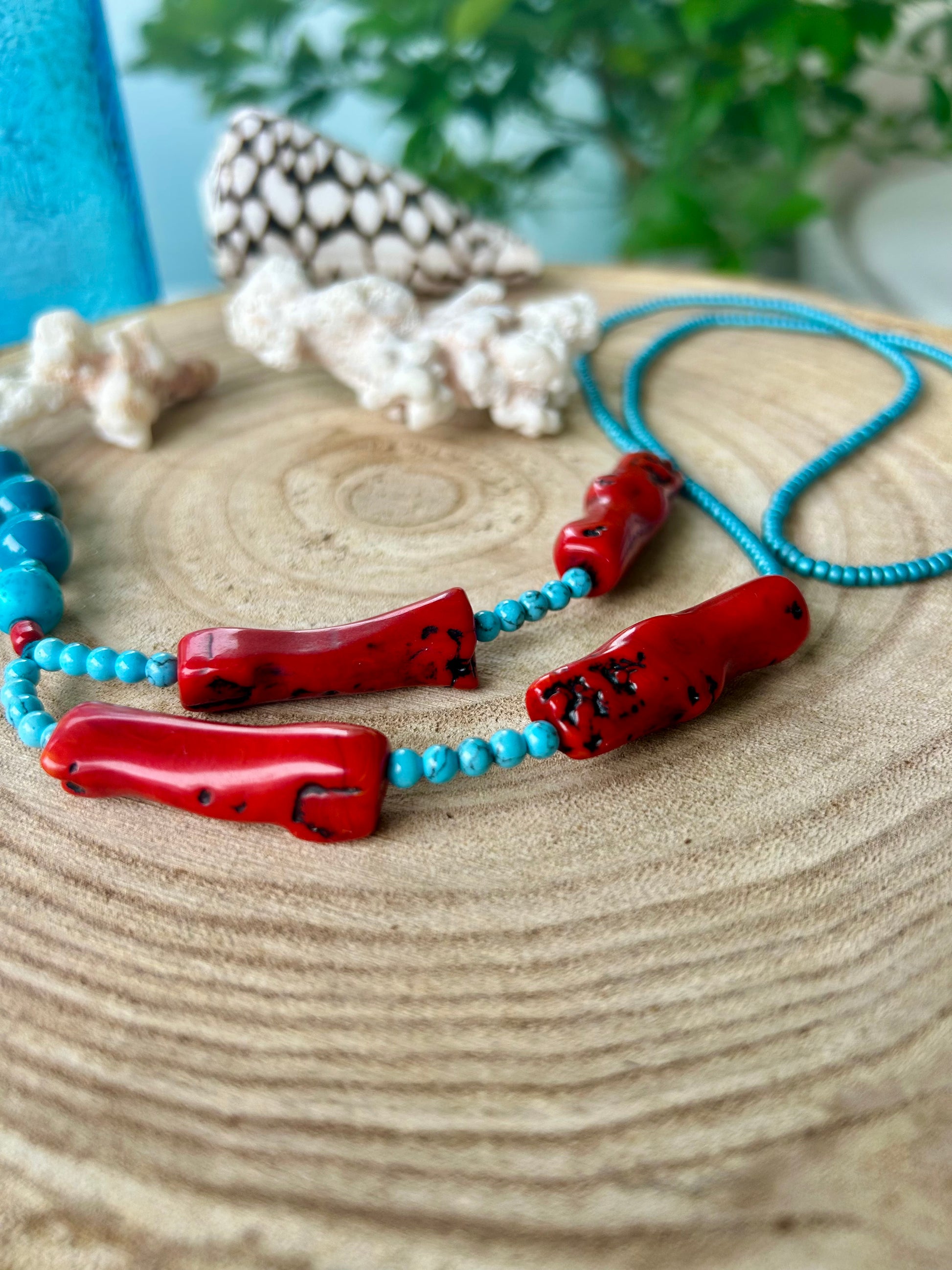 A vibrant necklace combining turquoise Toho beads and smooth azurite pearls, accented with sculptural red coral imitation beads for a dynamic, ocean-inspired design.