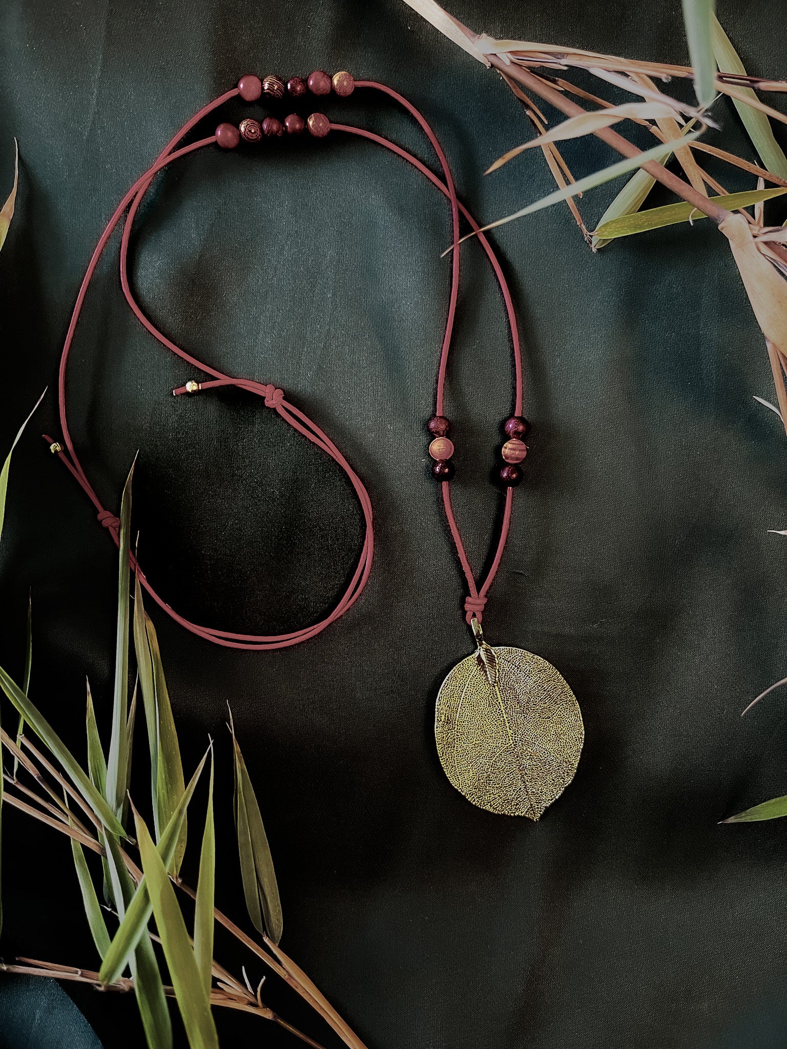 Handmade necklace featuring a vibrant red leather cord and natural wooden pearls, finished with a delicate gold-plated leaf pendant.