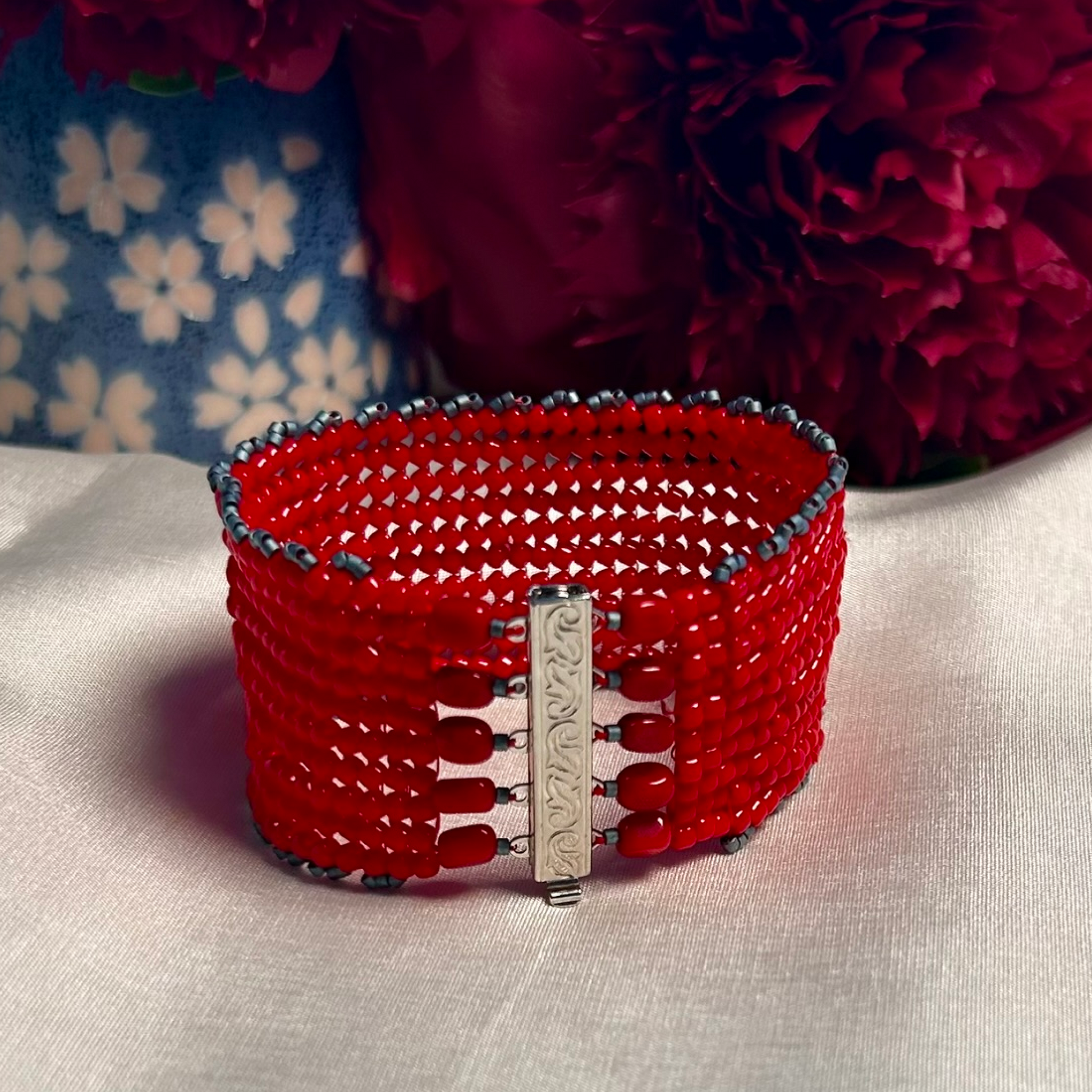 Bracelet with red and blue Toho beads, combined with red semi-precious stones and a silver stainless steel slide clasp.