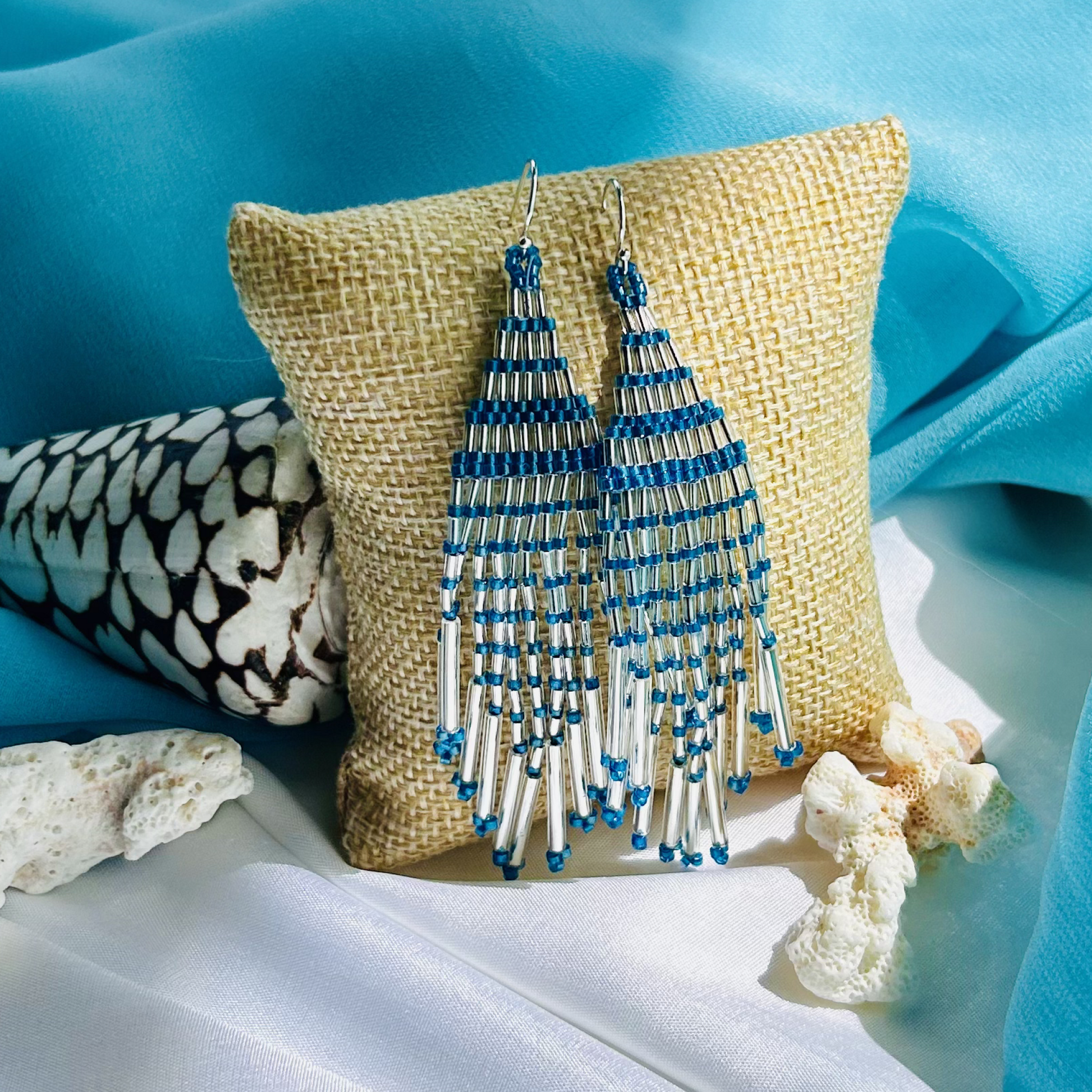 Stainless steel earrings with petrol blue Miyuki beads and silver bugle beads.