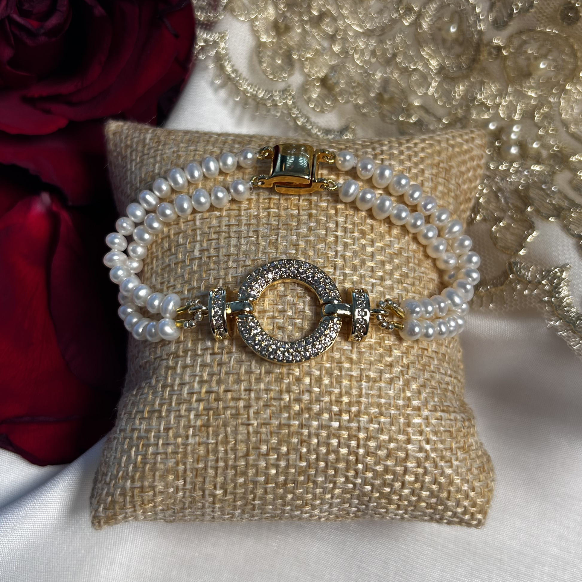 18-karat gold bracelet with genuine freshwater pearls, zirconia stones, and a gold magnetic clasp.